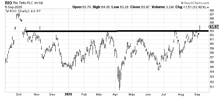 Rio Tinto RIO is a nice big base. It is also an ADR, so it trades very gappy, which means you could wake up tomorrow with the stock down several bucks. However, if you have patience for the gyrations, this is a good chart. I would like to see it stay over 60.
