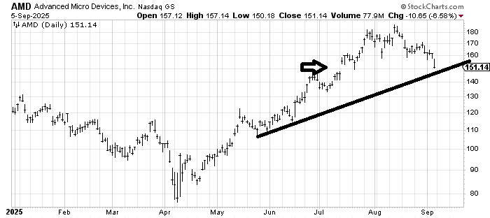 Advanced Micro Devices AMD hit its measured target when it got to 180, so I would need a new pattern to set up for me to like it again. However, in the very near term, it’s got support around 145 and a gap fill, so it ought to bounce from that area. The top it has just built is small and measures to 140. So if it can’t bounce from 145-ish, then I’d look for a bounce from 140-ish. If it can’t bounce until it gets to 140, then 160 resistance will loom large. I don’t love bottom fishing in it right now.