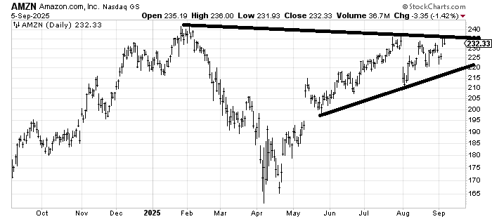 I had wanted Amazon AMZN to visit that uptrend line around 215 one more time after its earnings gap down, but it did not. Now there is the dilemma: do I anticipate a move up and over that downtrend line, or do I wait for the breakout over it? I am inclined to wait for the breakout just because so many charts are like this: the same place they were a month ago. See my comments on the banks above.