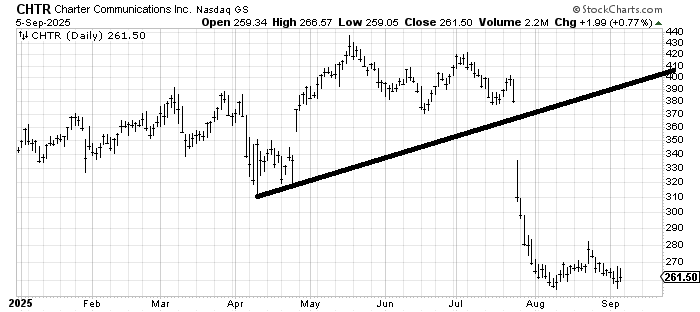 I would point out that Charter Communications CHTR has a similar look, and I would probably say the same thing about it: look for a bounce, but don’t fall in love because it is a candidate for tax loss selling as we get toward year-end. Both charts look like decent trades, but that’s it.