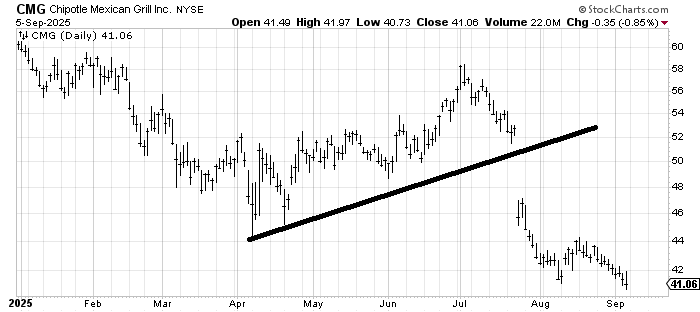 Chipotle Mexican Grille CMG has a measured target off that break of around 40-42, so it ought to find some support in the next few days and bounce. I would be careful about overstaying my welcome, though, because in about six weeks, we’ll get into tax-loss selling season, and this appears to be a good candidate for it.
