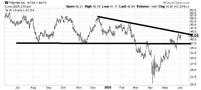Wayfair W has a lot of resistance to eat through, but as I said when asked back in April about it, the stock hit its downside target, so it needs to do some work to eat through the resistance. I wouldn’t be surprised if it crosses that line at 45, but there is still resistance overhead. I’ll call the stock a hold as long as it stays over 37.