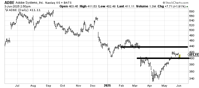 As long as Adobe ADBE can stay over 400, it gets the chance to fill that gap near 440. If it trades back under 400, I’d get concerned, especially with all those gaps down this stock has a tendency toward in the last year.