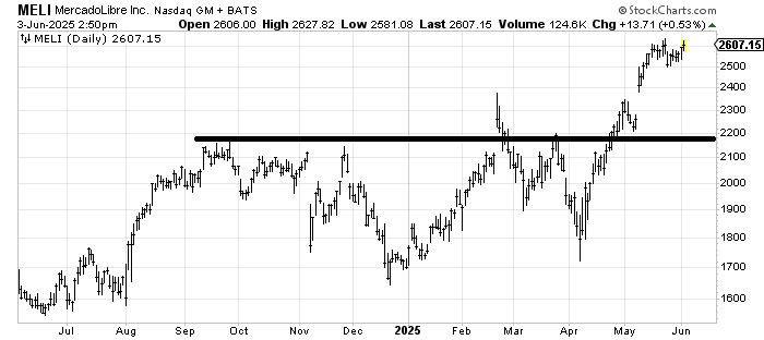 It has been a long time since I have been asked about MercadoLibre MELI, so I was a bit surprised to see it at its high. There is a measured target of around 2700. In the very near term, I don’t have a strong view if it gets there now or if it needs some time/corrective action before it makes a run up there. A move under 2500 would imply the short-term is vulnerable.