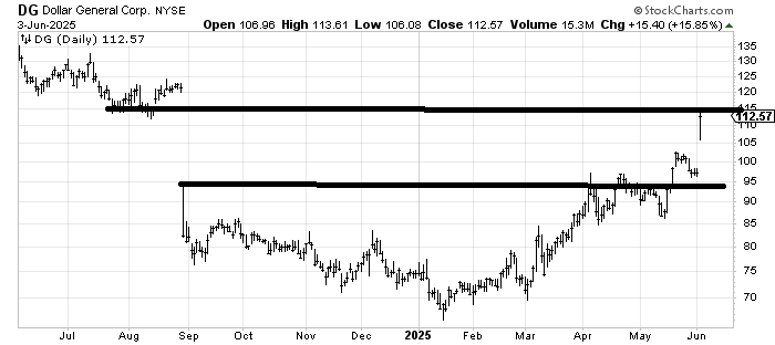 Back in March, I recommended Dollar General DG, and it finally filled the gap today. It has a lot of resistance in that 115-120 area, and it’s been a great ride. I wouldn’t argue against taking some profits here.