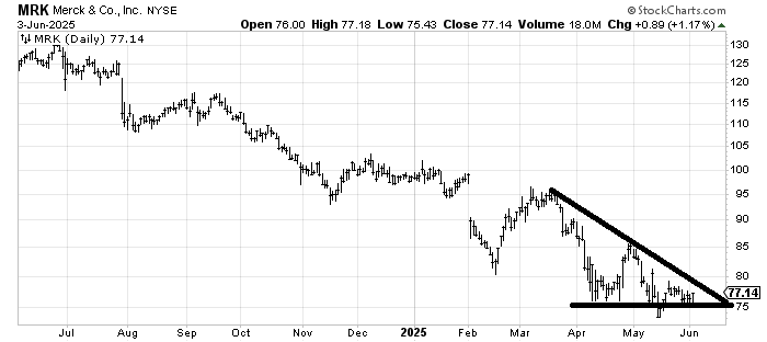 We’ll start with Merck MRK, which I was asked about when I warmed up to the drug stocks a few weeks ago. I was not willing to commit to Merck, but as someone who likes to bottom-fish, it has finally felt better to me. If it can get over that spike around 81, it would be a step in the right direction. I think it can.
