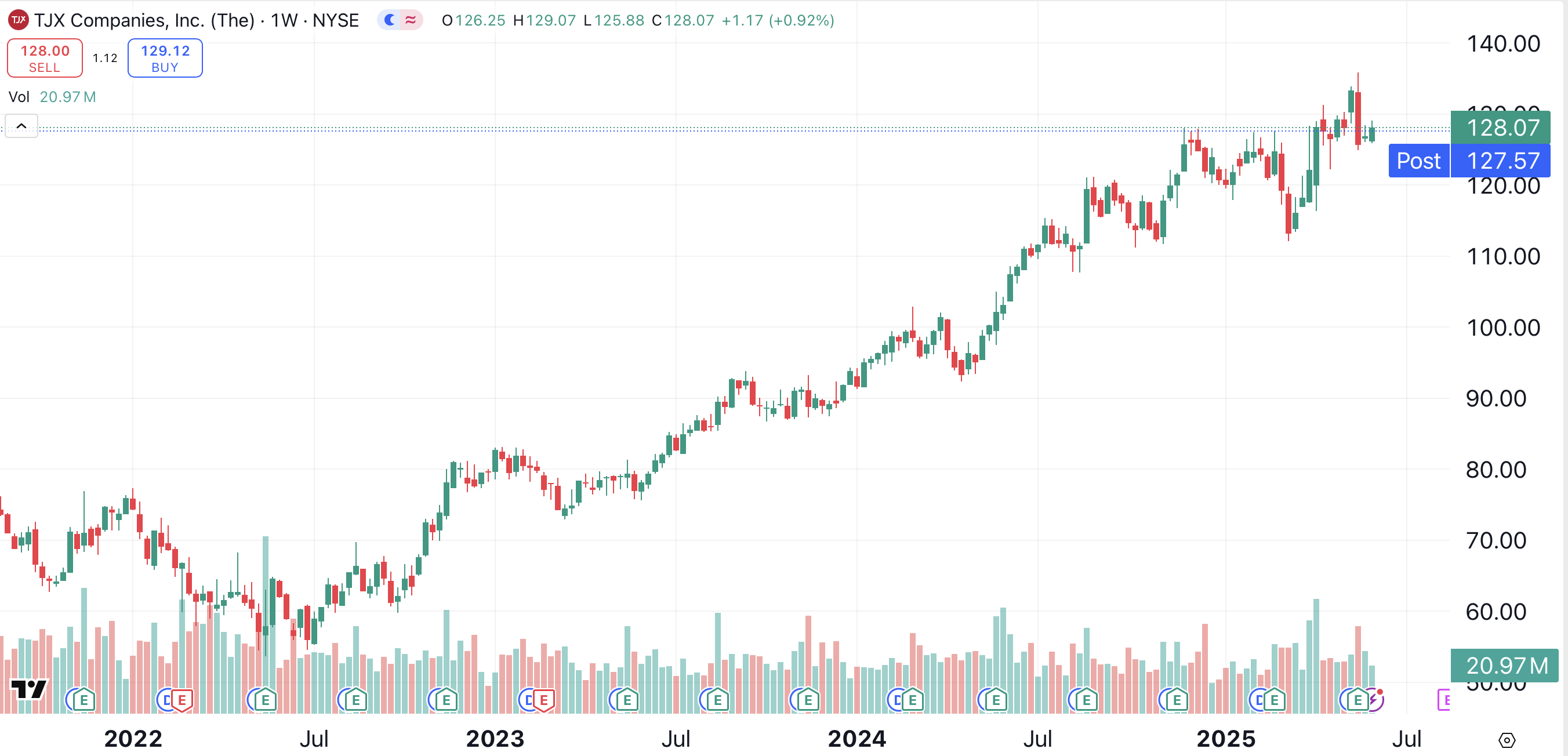 Despite Amazon’s dominance, TJX Companies has gained 21% over the past year, and 123% over the past five years. The TJX weekly chart demonstrates the steady appreciation of this stock over the past three years.