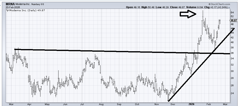 Moderna (MRNA) is still a good chart (another stock that did nothing on Friday), longer term, but in the near term, that spike high from January is going to be resistance. I just don’t see much to do right now except that you don’t want to see it break that uptrend line.