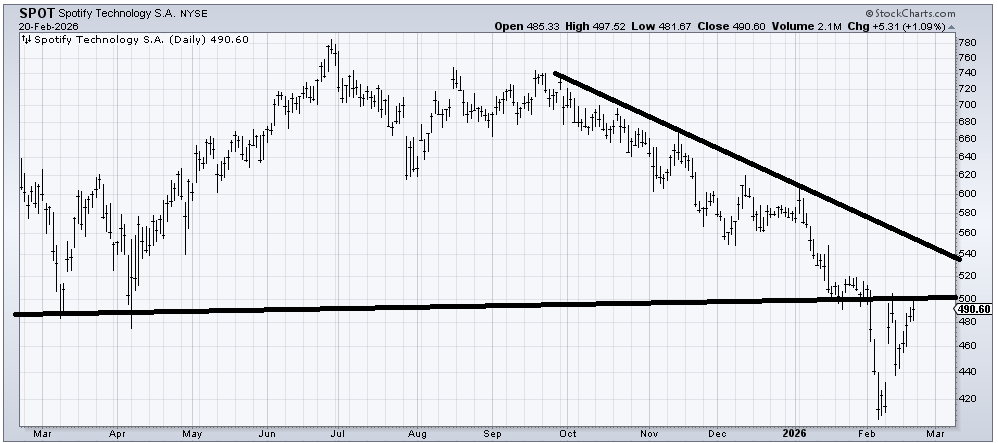 Spotify (SPOT) had a great pop on earnings, gave almost all of it back, and is now right back at/near resistance. If it can get through 500, there is still a lot of resistance in that 520-540 area. For the time being, I’d say it’s one of those charts that is trying to bottom, but there is a lot to chew through on the upside.