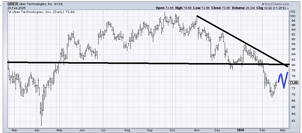 A few weeks ago, I said I thought if Uber (UBER) could hold that 78-80 area, I thought it was okay. It promptly collapsed to prove me wrong; it was not okay. It is, however, short-term oversold enough to rally some more. Ideally, you want to see it map out with a pattern somewhat akin to what I have drawn in blue, but on a more intermediate-term basis, that 80 level is serious resistance.