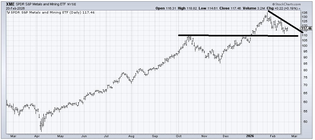 (XME) is one of those charts that did not move on Friday, but it did bounce off support earlier in the week, so as long as it holds over 110, these last four weeks look like just a correction. Crossing over 120 would be a plus.