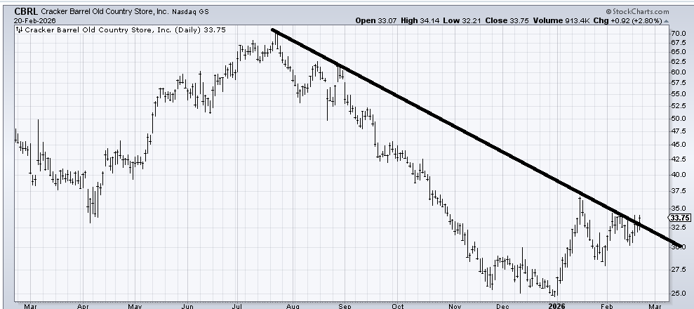 Someone asked about Cracker Barrel (CBRL) a week or so ago, so I have kept my eye on it because, at the time, the stock seemed iffy. But Friday, it started peeking out over that downtrend line. A stop would be quite far away (under 30), but if the chart can have some follow-through to the upside, I’d think this is a change, a positive for the chart.