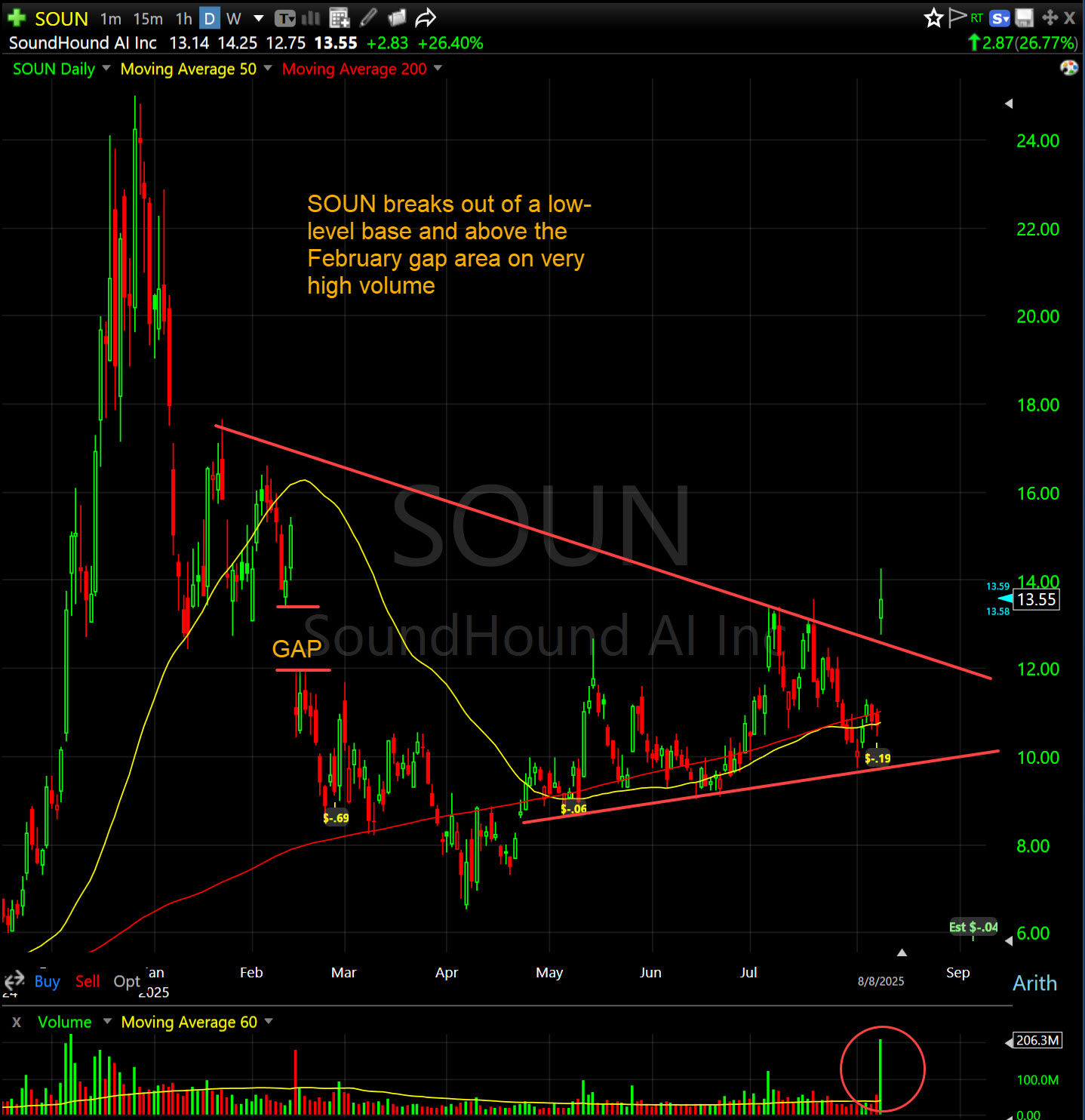 Technically, the stock broke out of a low-level base and formed a "pocket pivot" pattern. Volume was extremely high and should attract increased interest. There is a large short position also, which may help to fuel additional upside.