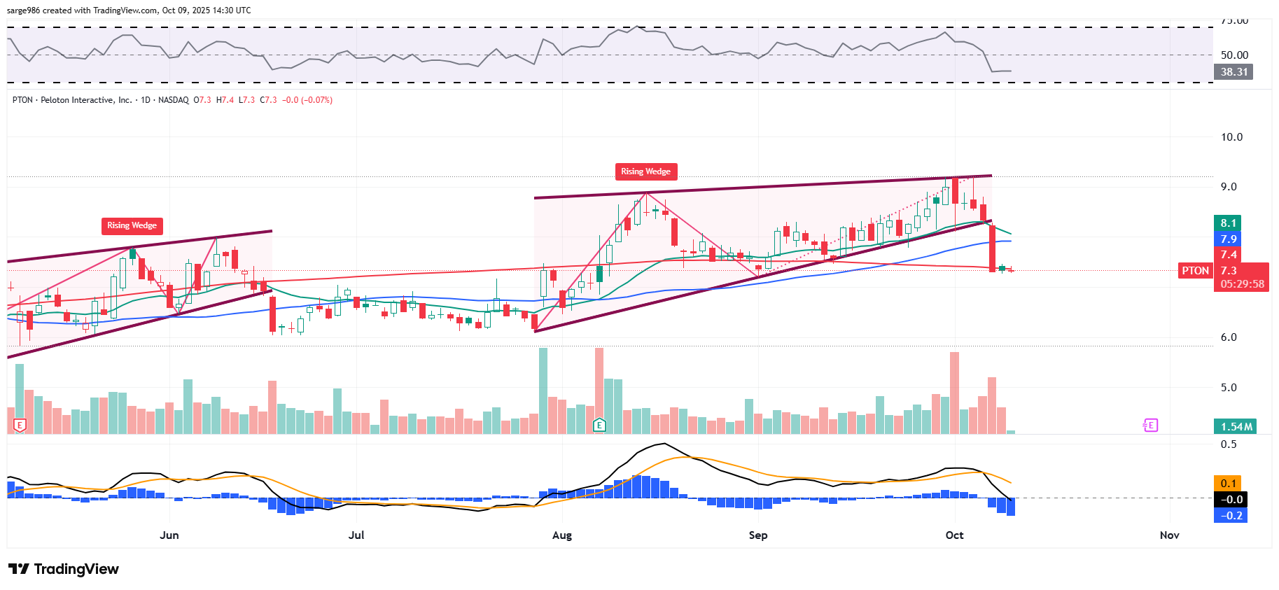 Readers may recall that I wrote to you on October 1 and warned that Peloton Interactive (PTON) had developed a second Rising Wedge pattern, which is a pattern of bearish reversal. I pointed out what happened once the first Wedge came to its completion and planned to add down to the stock's 50-day simple moving average (SMA).
