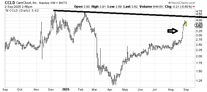 CareCloud (CCLD) had a nice spurt in late August and now seems to be digesting the move. My guess is the stock will rally again after the pullback (possibly to fill that tiny little gap around $3.25 — arrow on the chart). What I am unsure of is if the next rally can get over that resistance line. The chart tends to have spikes and then a whole lot of nothingness after. If it does rally after filling that gap ping me on this again and we can re-assess.