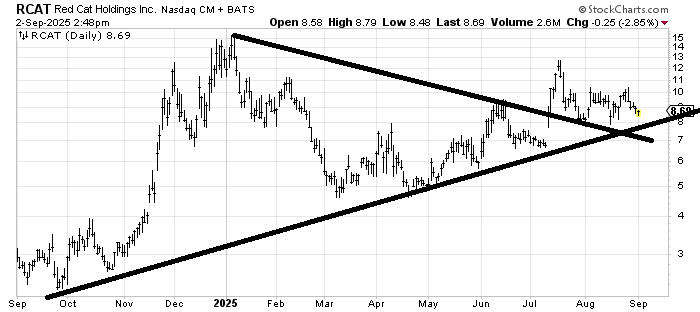 Red Cat Holdings RCAT needs to hold that uptrend line/support around $8-ish. I suppose it might even opt to fill the gap around $7. The chart looks mostly sideways to me.