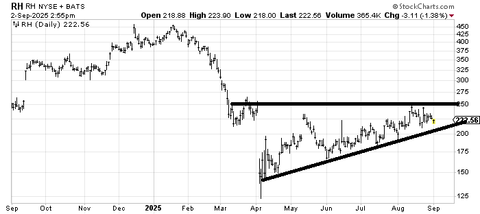 RH RH is like so many stocks: a whole lot of nothing. It tried to break out but couldn’t. So far it hasn’t been able to break down. Even if it breaks the uptrend line (around $200) there is still support all the way down.