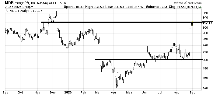 MongoDB MDB is at resistance. I would have loved it to fill that gap around $340 but it has not done so. I suspect it tries to do so. Can it pull back first? Yes, but if it comes back to that $220-240 area do you really want to hold on for such a pullback? The chart has so many gaps over the years my inclination is to hold with a tight stop rather than chase.