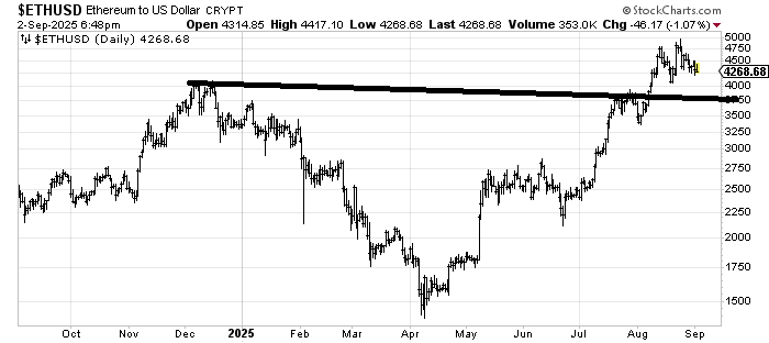 I cannot get excited about the chart of Ethereum ETH. If it came down to $3,750 (the line) I might be convinced it would rally from there. Longer term, the chart says it ought to measure to $5,700-ish. I just prefer when a pattern sets up or it’s down and out and this has neither.