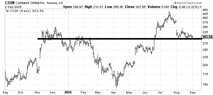Prior to my vacation I discussed that I wanted a pattern to set up in certain stocks, such as Palantir PLTR and Coinbase COIN. Coinbase is coming along. Notice how it is struggling to break that $300-ish area and just keeps bouncing around. A move up and over $300-ish. I think I am a bit early.