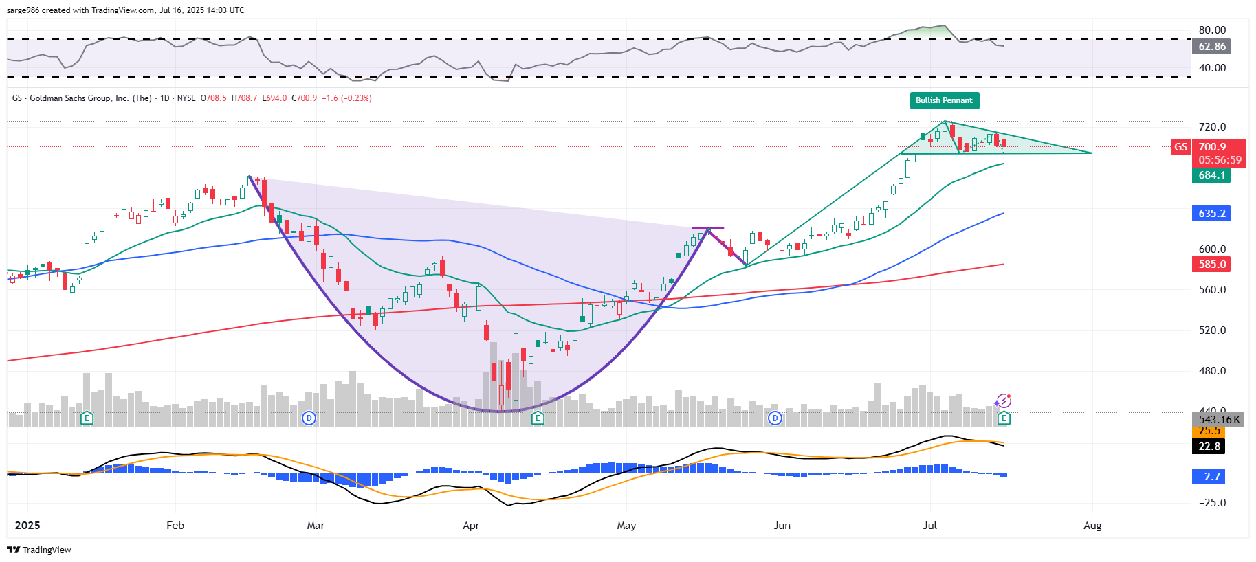 It appears that the shares of Goldman ​may be setting up for another leg of the stock's recent rally. I show readers here a cup-with-handle pattern with a $620 pivot that stretched from mid-February into late May. This produced a breakout that took the shares all the way up to $726 before they paused.