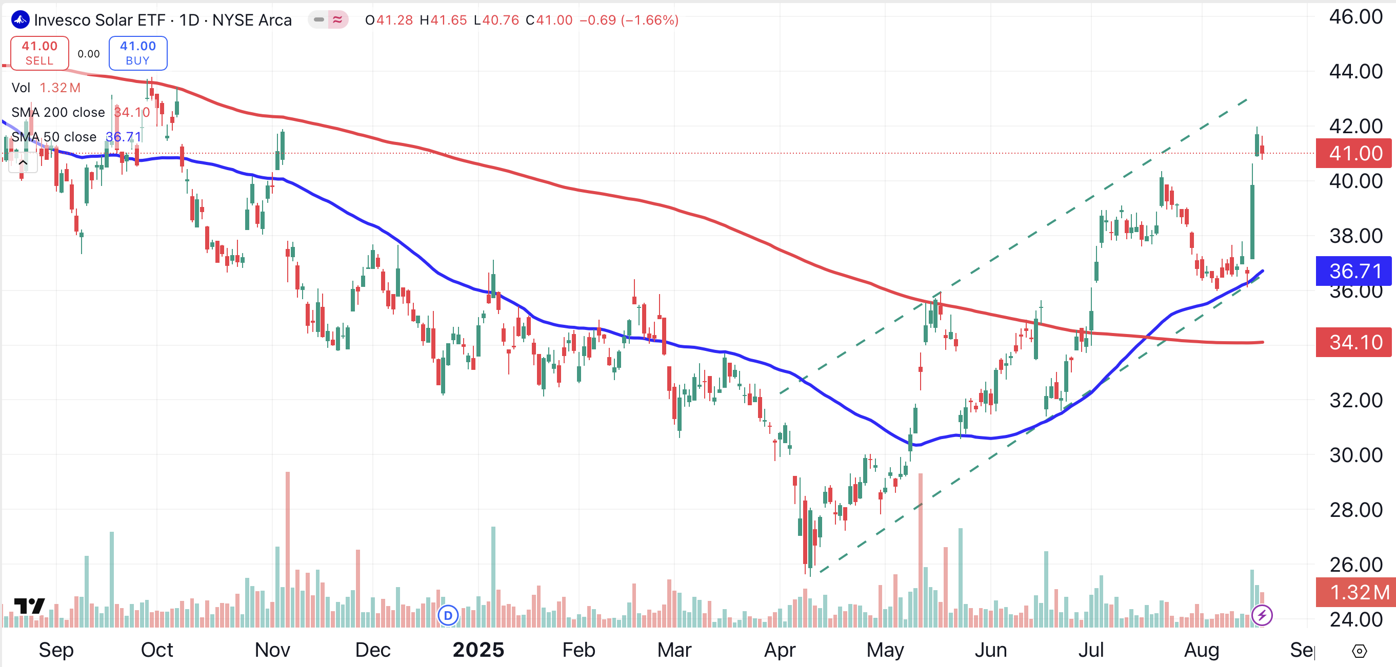 To get a broad view of the solar sector, let’s look first at the Invesco Solar ETF TAN. On Monday, TAN closed at its year-to-date high. The ETF has been trending higher since early April.