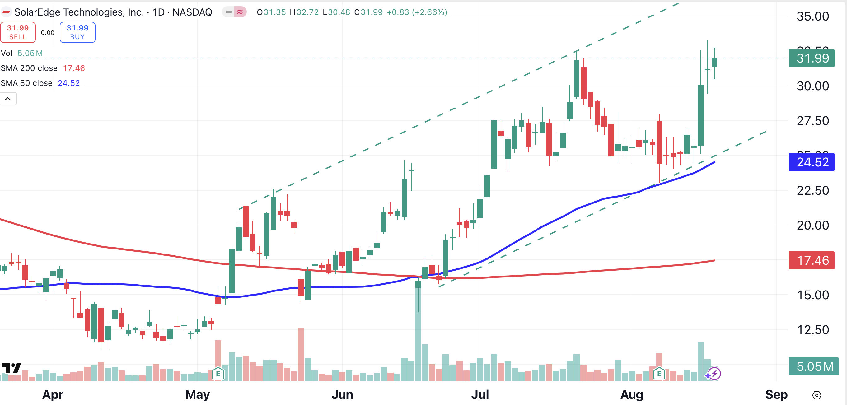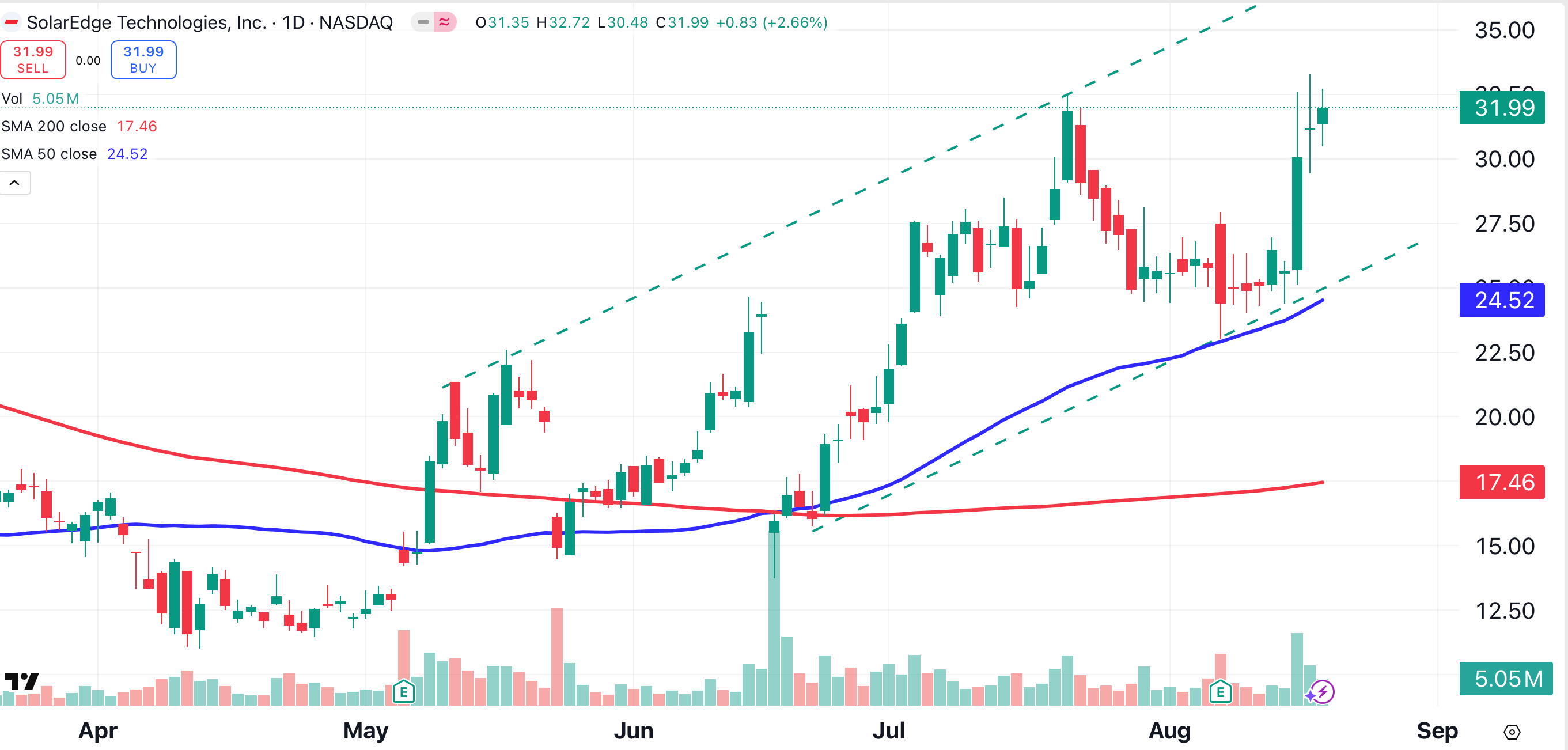 However, the attack angle of the trend is less pronounced, and the volume increase is less dramatic, compared to First Solar. Although the stock has just reached a one-year high SolarEdge isn’t leading the charge in this rally. Instead, it’s along for the ride.