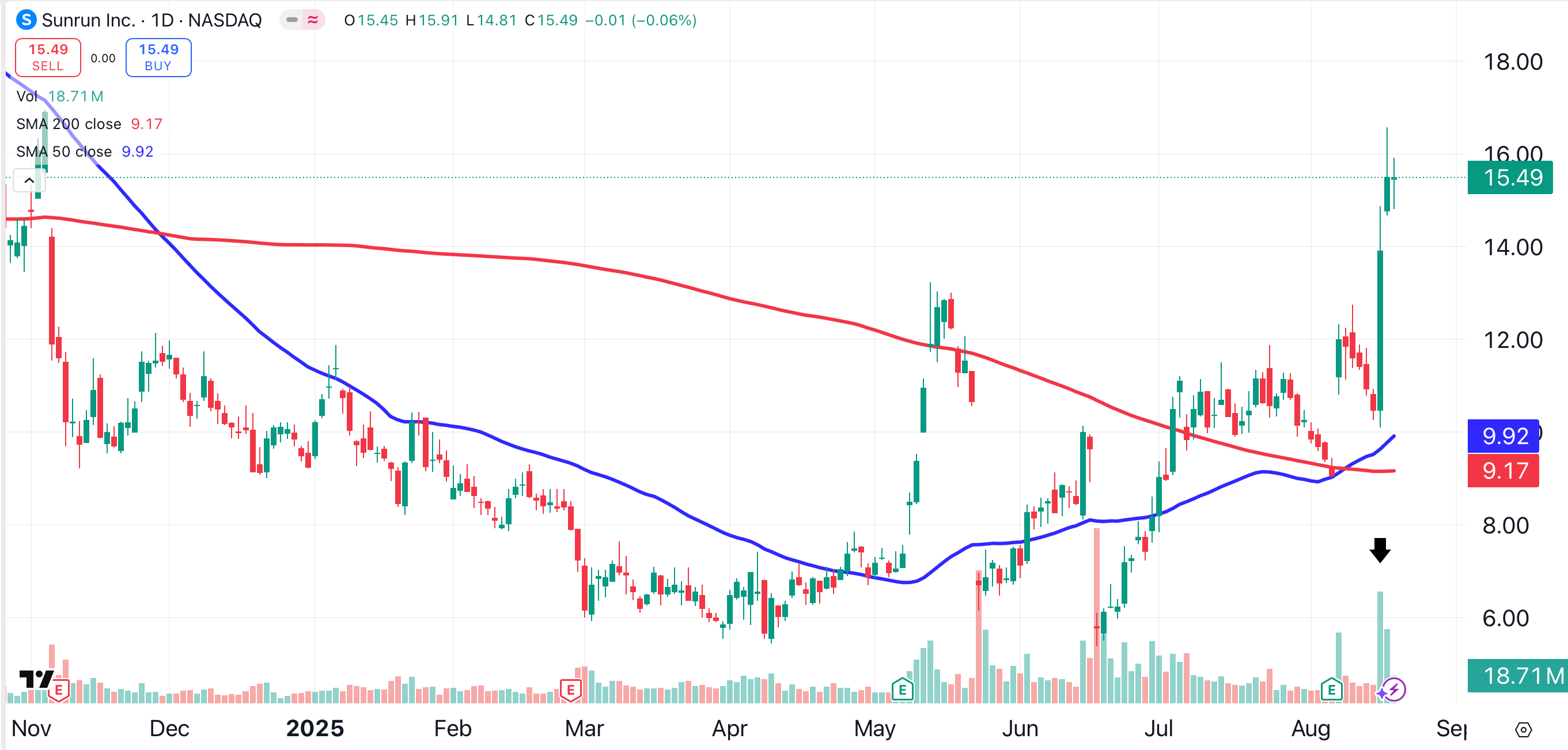 Like First Solar, Sunrun Inc. RUN also reached its highest price for the year this week. Last month, Sunrun crushed second quarter earnings and revenue estimates. This week, the stock is climbing on very heavy volume (black arrow). Sunrun shares have gained nearly 80% over the past six months.