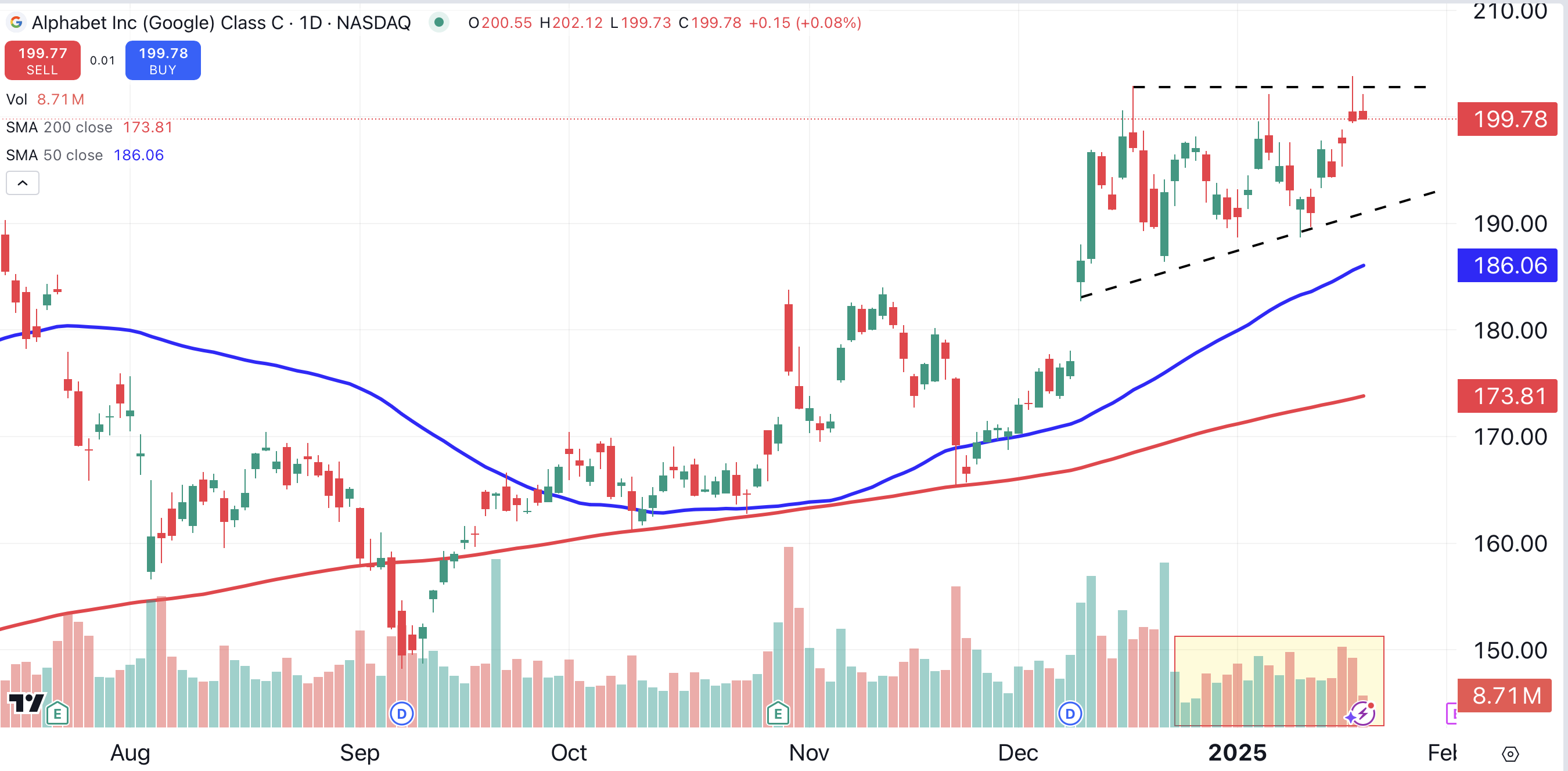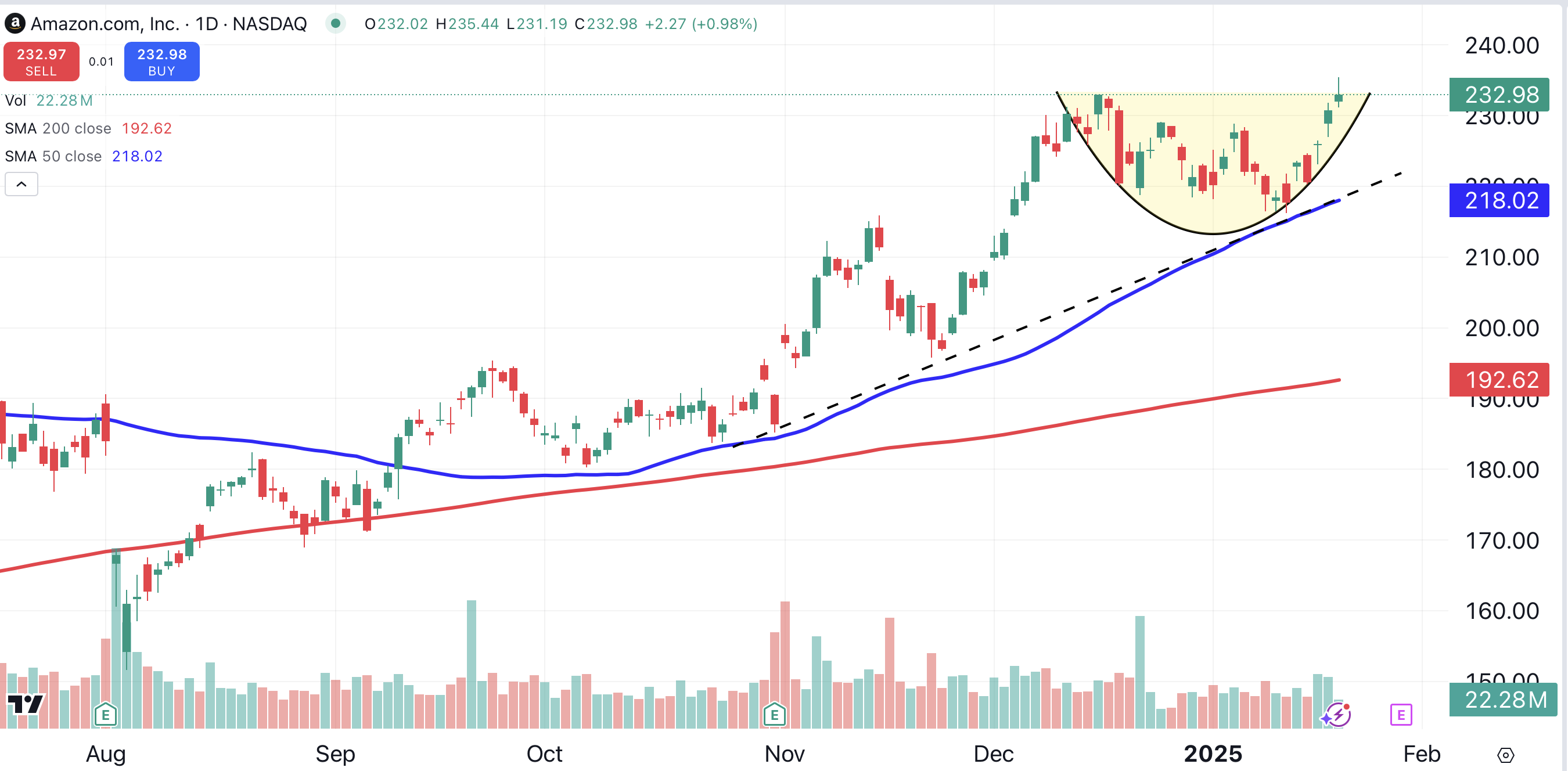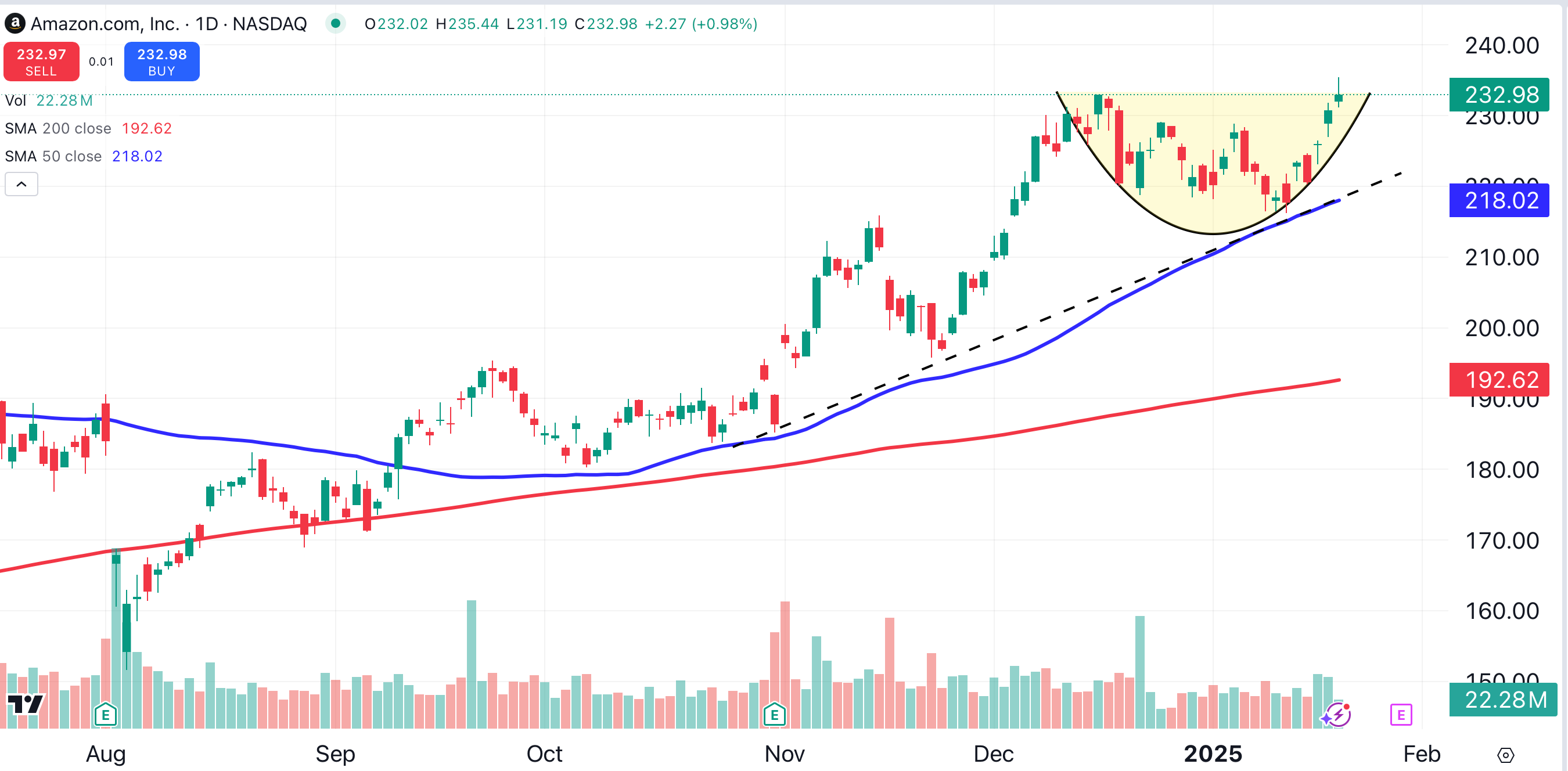 Amazon’s chart reveals a consolidation of the stock’s recent gains (shaded yellow). The stock is supported by its 50-day moving average (blue), which parallels a bullish trendline (black dotted line).