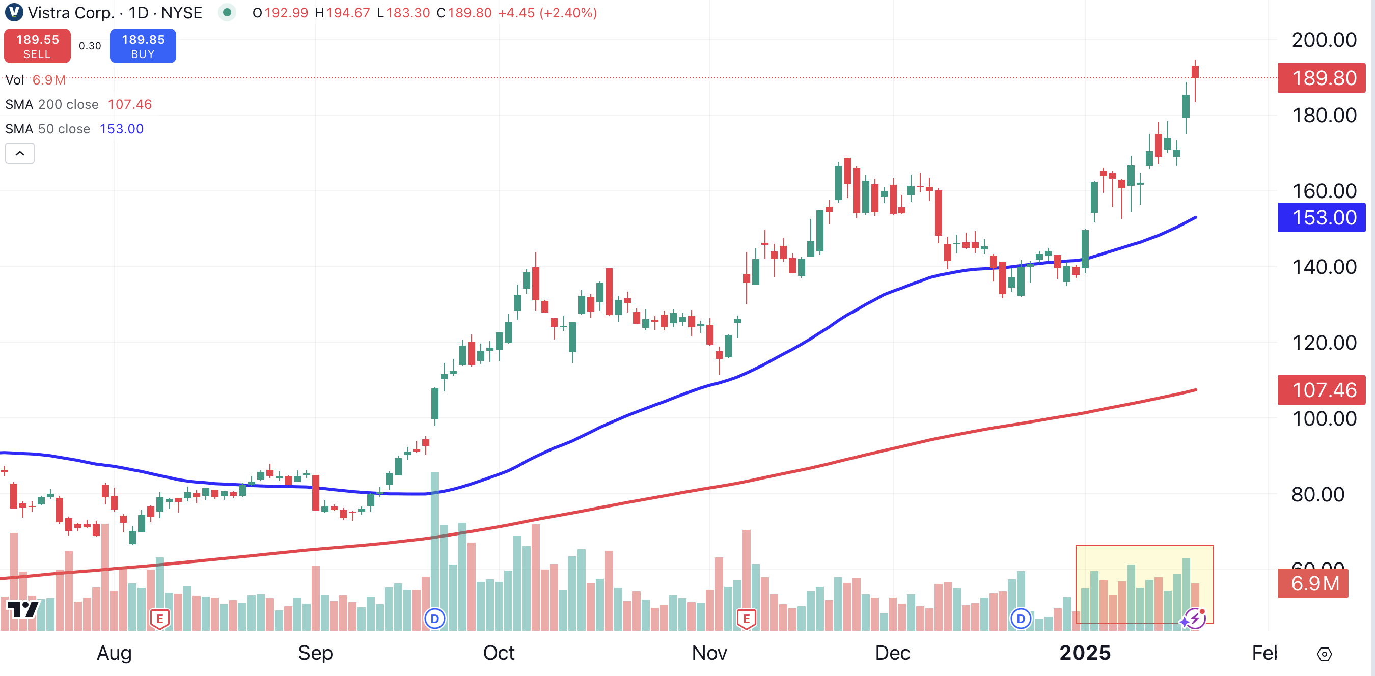 In addition, Pelosi purchased 50 contracts of $50 calls for Vistra Corp. VST, also expiring on January 16, 2026. On Wednesday, the stock traded at an all-time high. The Irving, Texas-based Vistra is rising steadily on increasing volume (shaded yellow).