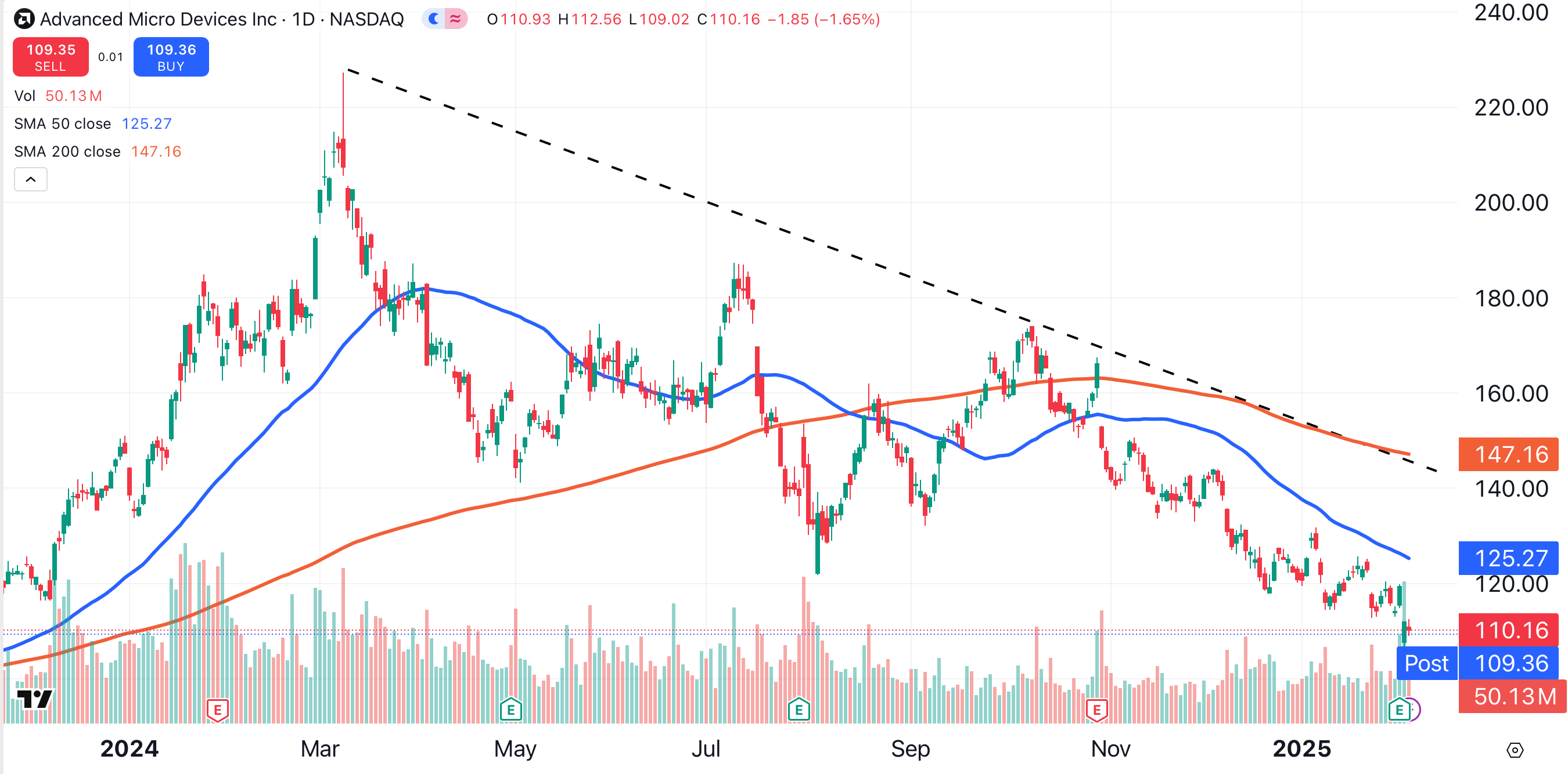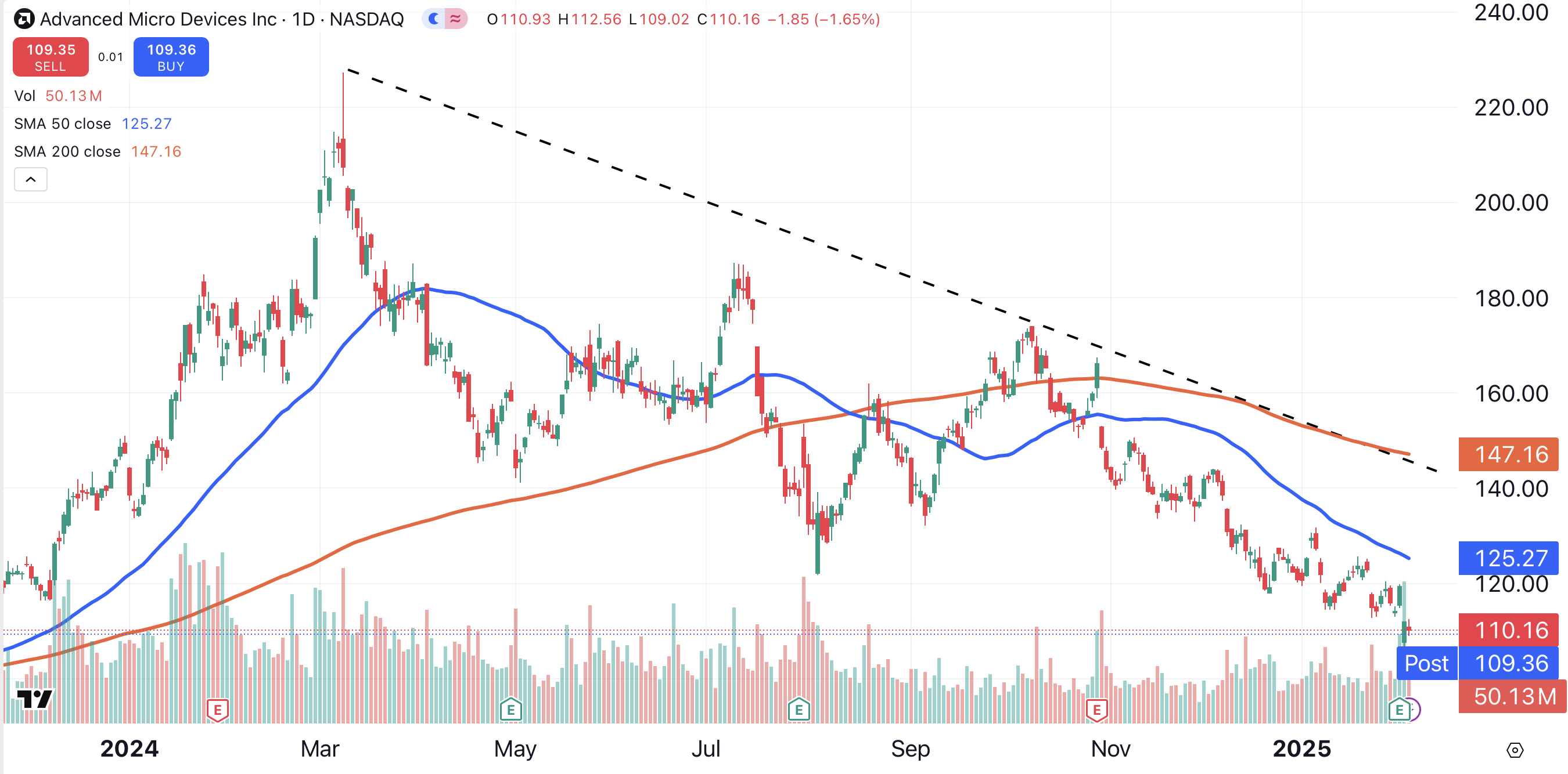 AMD shares have fallen 15% over the past month. The stock is trading below its 50-day moving average (blue), 200-day moving average (red), and its bearish trend line (black dotted line).