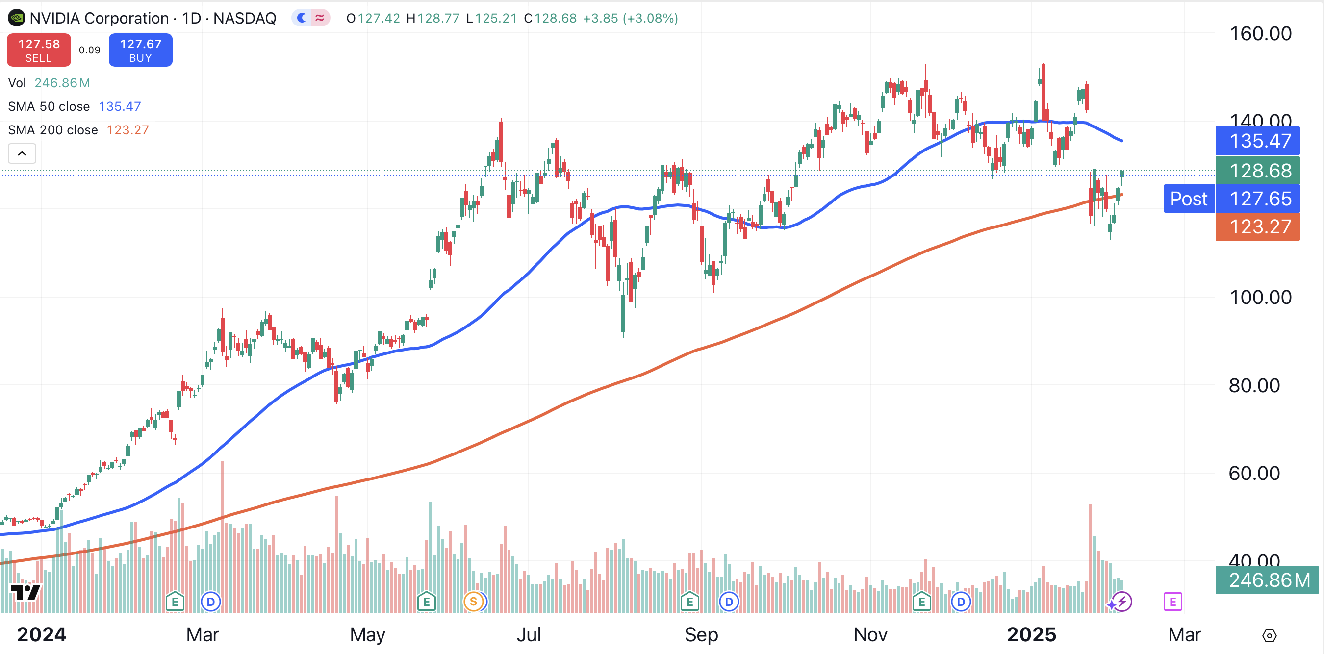 The manufacturer of AI-related chips is trapped between its 50-day and 200-day MAs. Nvidia’s 50-day moving average is tilting downward for the first time since September. Nvidia is scheduled to report earnings on February 26.