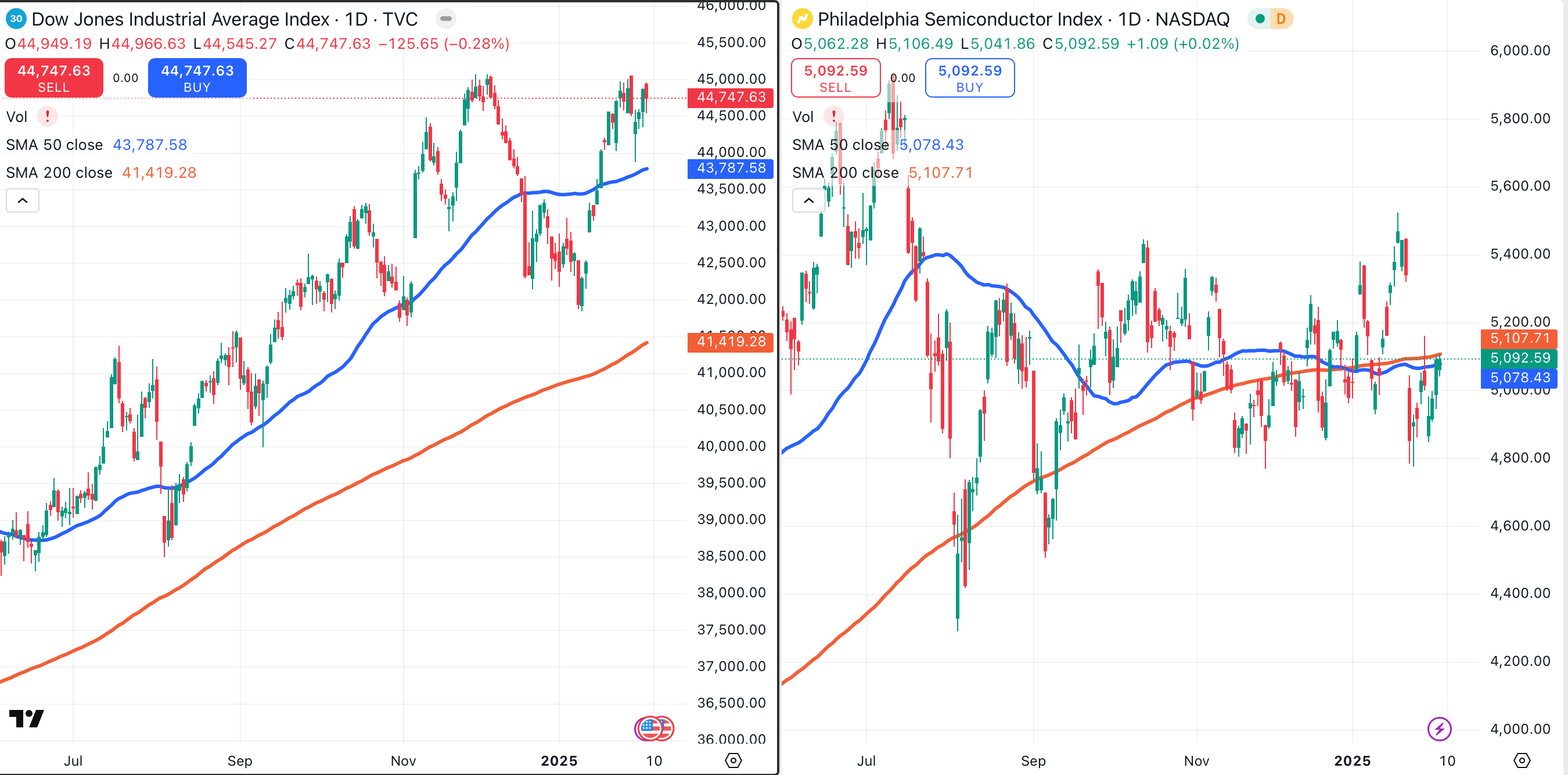 This comparison chart of the Dow Jones Industrial Average (left chart) and the PHLX Semiconductor Index, or SOX (right chart), demonstrates just how badly the semis have underperformed the broader market.