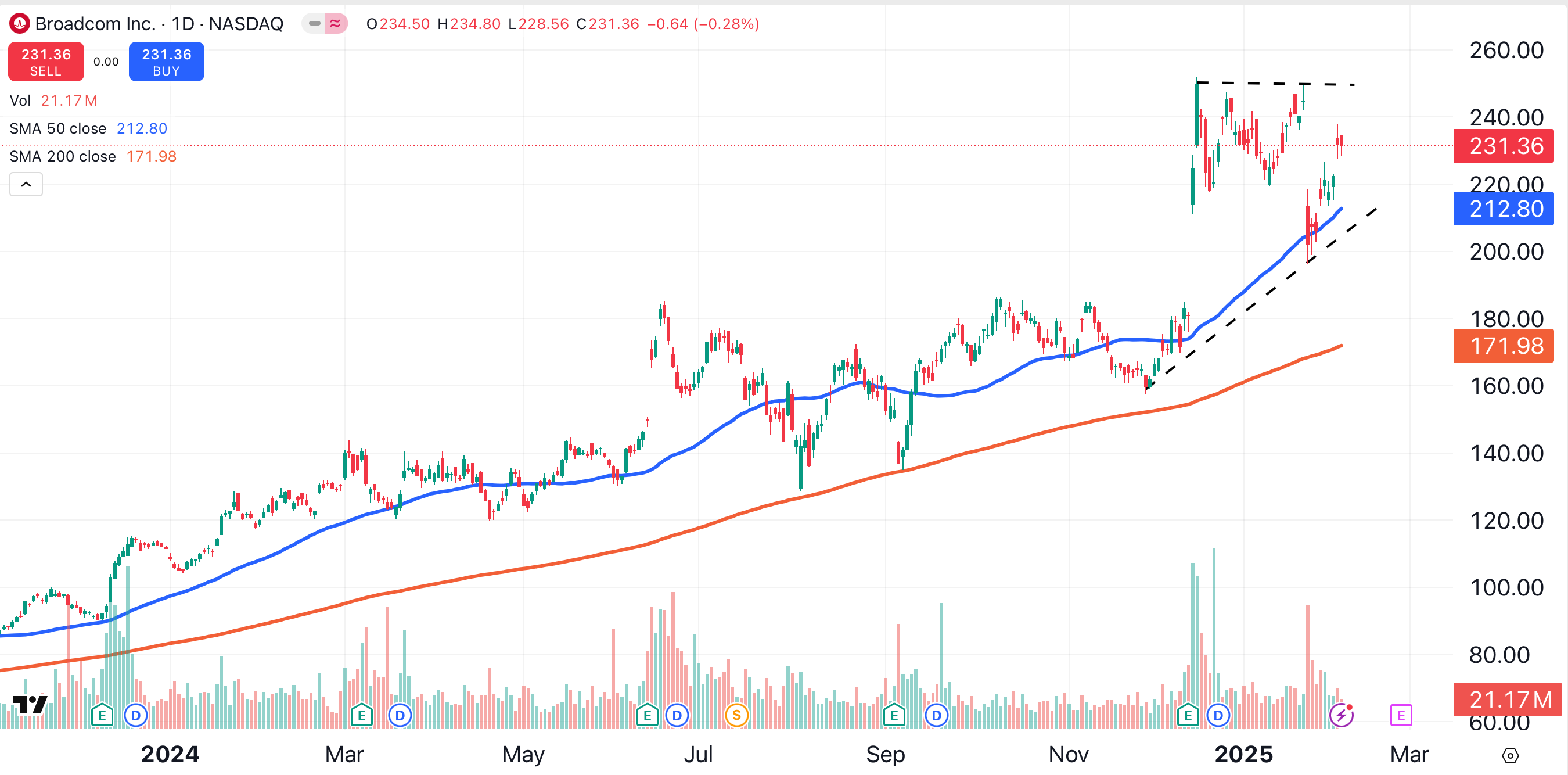 Broadcom is trading above its key moving averages, and has formed a bullish technical pattern known as an ascending triangle (black dotted lines). The pattern suggests Broadcom could eventually reach $300.