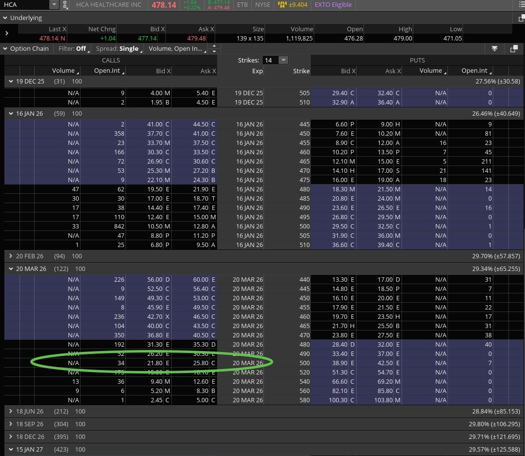 The chart is strong and overbought in the $470s, but HCA can live overbought for some time, as the RSI remains strong. The $500 target is not far off, and while it might be right to wait for a lower entry point we could put down a medium-term trade to ride the current momentum wave. That target is only 6% away, we can buy a March 2026 500 call (see below) for about $23.50 dollars, or 4.7% the price of the stock. The expected move is about $30.