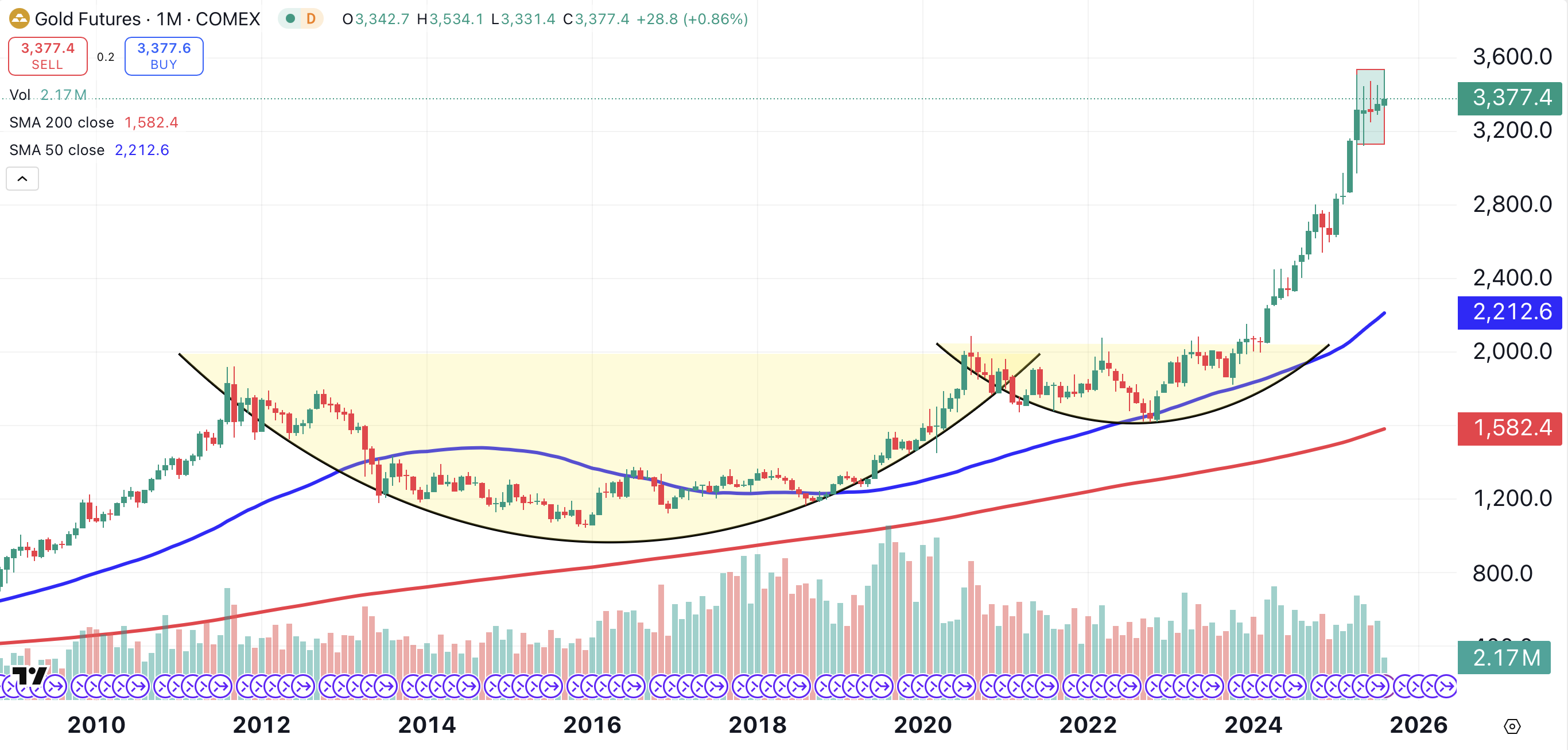 Since then, little has changed for gold investors. Over the past four months, gold has been trading in a range between $3,123 and $3,534 (green shaded area).