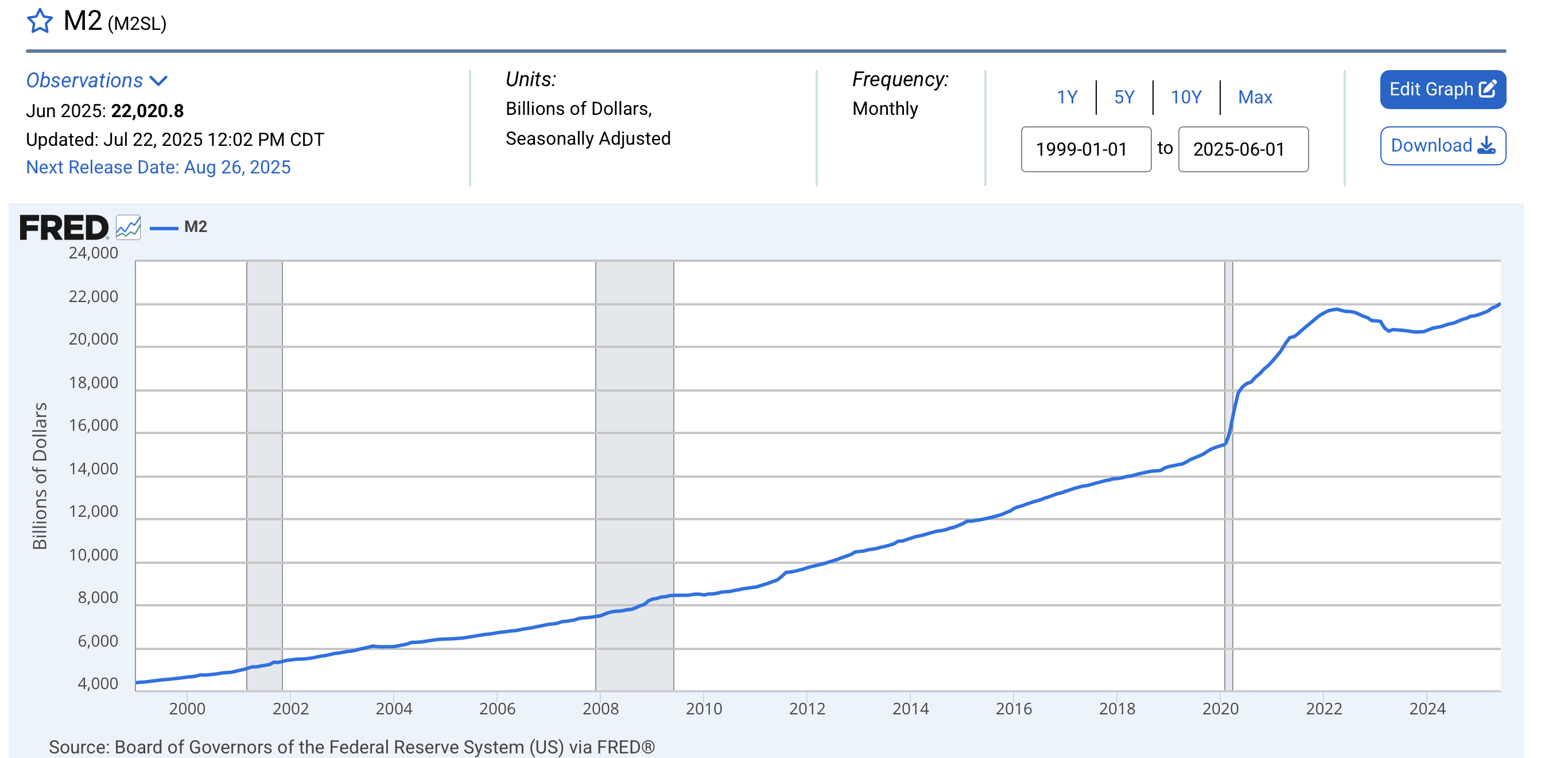 The following chart, courtesy of Federal Reserve Economic Data (FRED), shows that after a pause, the M2 money supply is once again on the rise.