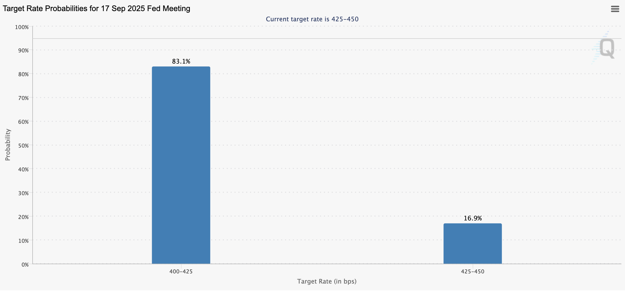 As of August 18, the odds of a rate cut at the Fed’s September 17 meeting stood at 83.1%, according to the CME’s FedWatch Tool (below).