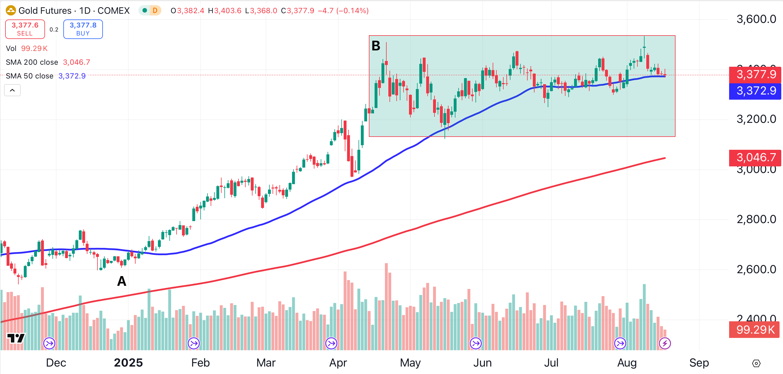 At the beginning of this year, gold traded near $2,640 per ounce (point A). By April, the price of the yellow metal had climbed to $3,509 — a gain of about 33% in just four months (point B).
