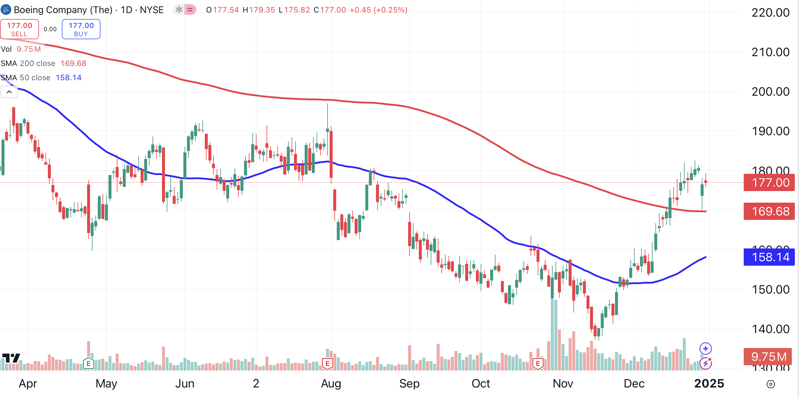 In mid-December, the stock climbed above its 200-day moving average (red) for the first time in nearly a year. Boeing will be my first buy of the new year.