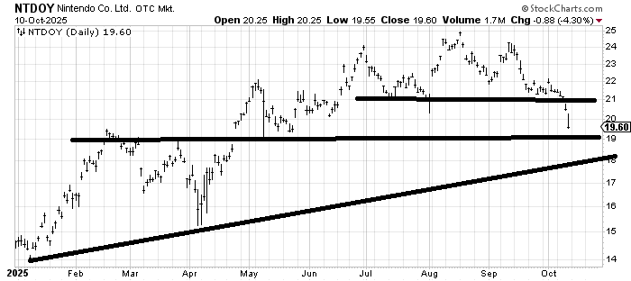 Nintendo (NTDOY) looks like a top to me. I would suspect it bounces off $18-19 though because there is support there. For the time being if NTDOY cannot get back over $21 I would view this as a stock building a top. For now that $18-19 area better hold.