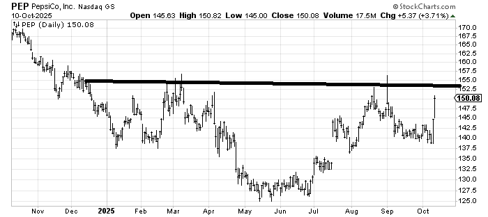 PepsiCo (PEP) has had a really good few days (finally!) and is still working on that head-and-shoulders bottom. It is hard for me to believe that the stock can break out and keep running right now, though. This is Pepsi, not some hot tech stock. So near there, that $152-155 area ought to give it a pause/pullback. But longer term if/when it gets through there my target would be back near that old high around $170-ish.
