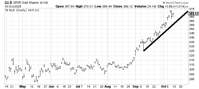 I do not have a spot I would buy SPDR Gold Shares (GLD) . I liked GLD back in August when it had gone sideways for months and a pattern had set up. Now there is no pattern, and there is also sentiment bordering on giddy. For the near term it probably doesn’t break that uptrend line but I need a pattern to set up, and it hasn’t done so. I still think GLD can use a correction.