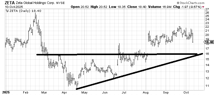 Zeta Global (ZETA) met its measured target from that base when it tagged $21-22. If it gets down to that $16 area in a few weeks then it will have filled the gap and found support so I would take a look at it again there and see how it looks.