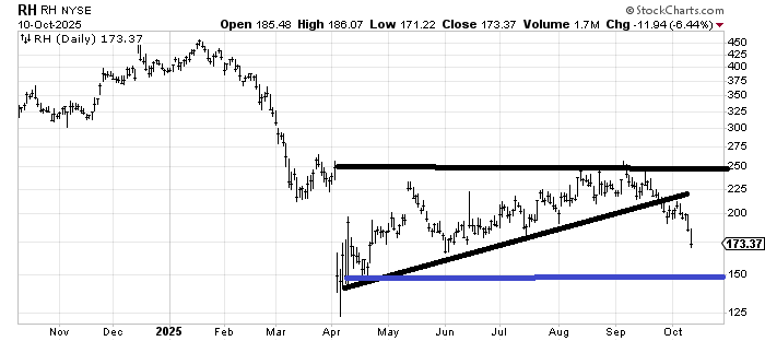 RH (RH) has some light support at $170-ish but better at $150 (blue line). For the time being I expect the blue line to hold that area. If it doesn’t do so, then obviously that April spike low comes into play. But first let’s see if we get a little bounce from this $170 area and then if $150 can hold.