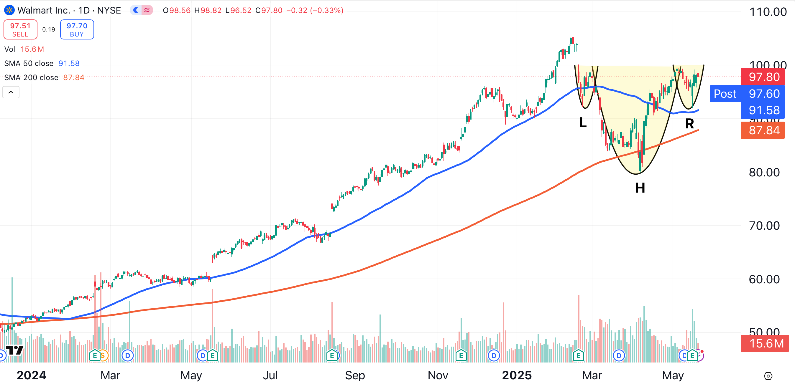Walmart is trading above its 50-day (blue) and 200-day (red) moving averages. Walmart’s chart has formed an inverted head and shoulders pattern (shaded yellow), which projects the stock to the $120 area.