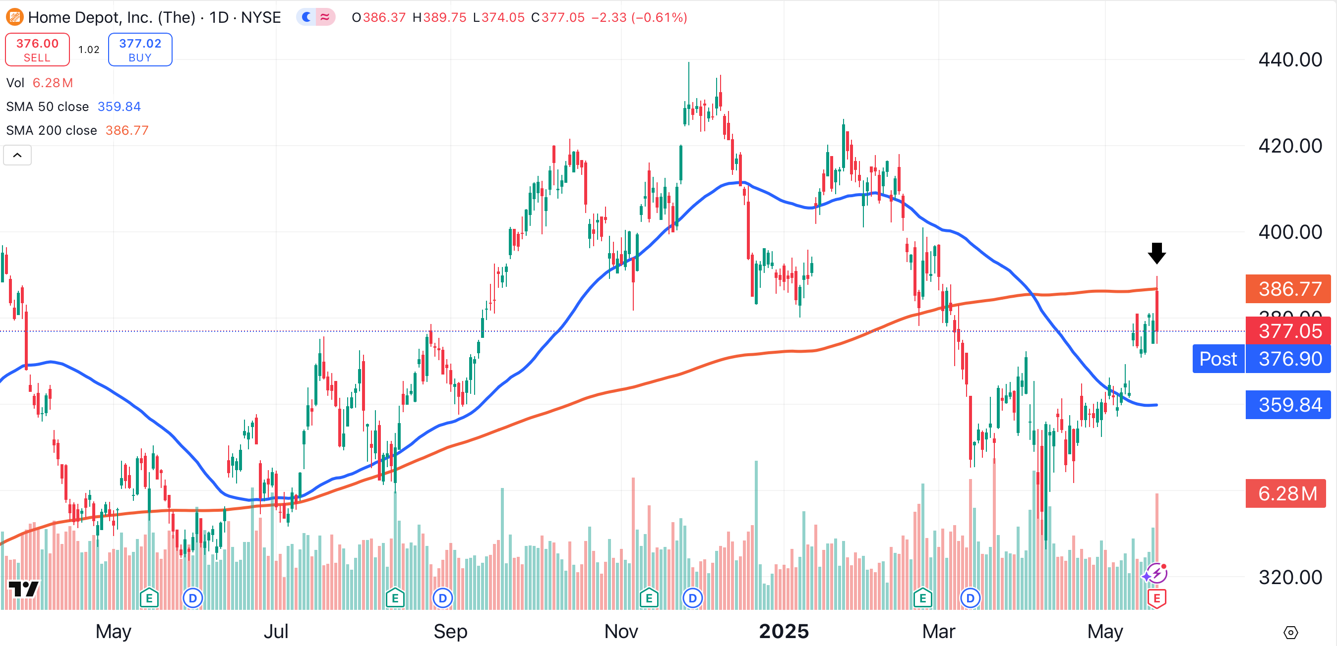 Home Depot popped after reporting earnings on Tuesday morning. The stock gapped right into its 200-day moving average (red), where it was rejected on heavy volume (arrow).