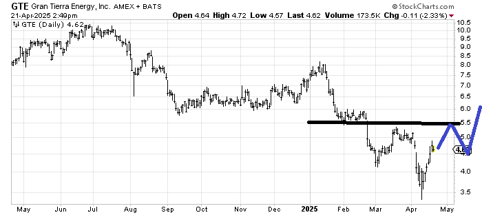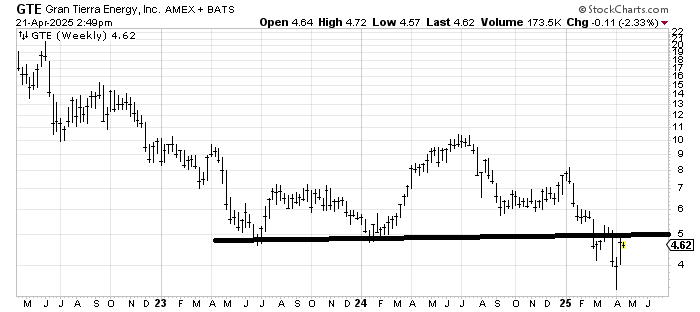 Gran Tierra Energy GTE might be trying to make a bottom on the daily chart, but the resistance at 5-5.50 is strong. If it can map out over the ensuing months as I have drawn in, then I might be a bit more friendly toward it.