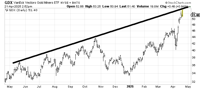 GDX, an ETF to be long gold stocks, has lagged Gold itself quite a bit, and today was no exception as it tried to make a higher high and gave it up. Then there is that resistance line up there as well. There is a measured target in the 54 area, but it got to 53.25 today. Keep in mind the DSI keeps knocking on the door of 90, so this is the time to take a little off the table and wait for a correction.