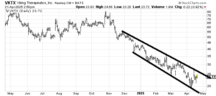 Viking Therapeutics VKTX has been in a down channel for the last several months. Unless or until that changes, I see no reason to bottom fish it. Resistance is strong all the way up. If it falls to the lower line, then it’s probably buyable for a trade, but that’s all I see here.